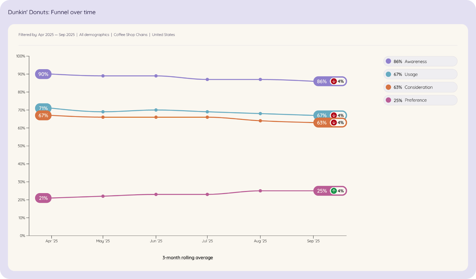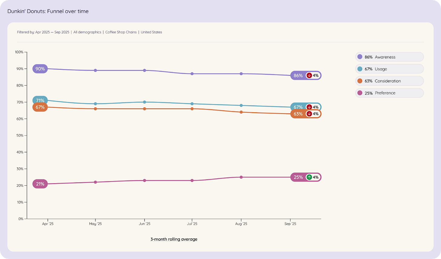 Since April 2025, Dunkin’s brand awareness in the coffee shop chain category has dropped from 90% to 86%. However, Dunkin’ has seen a 4% increase in brand preference, a meaningful shift, because preference isn’t just about recognition; it’s about identity.