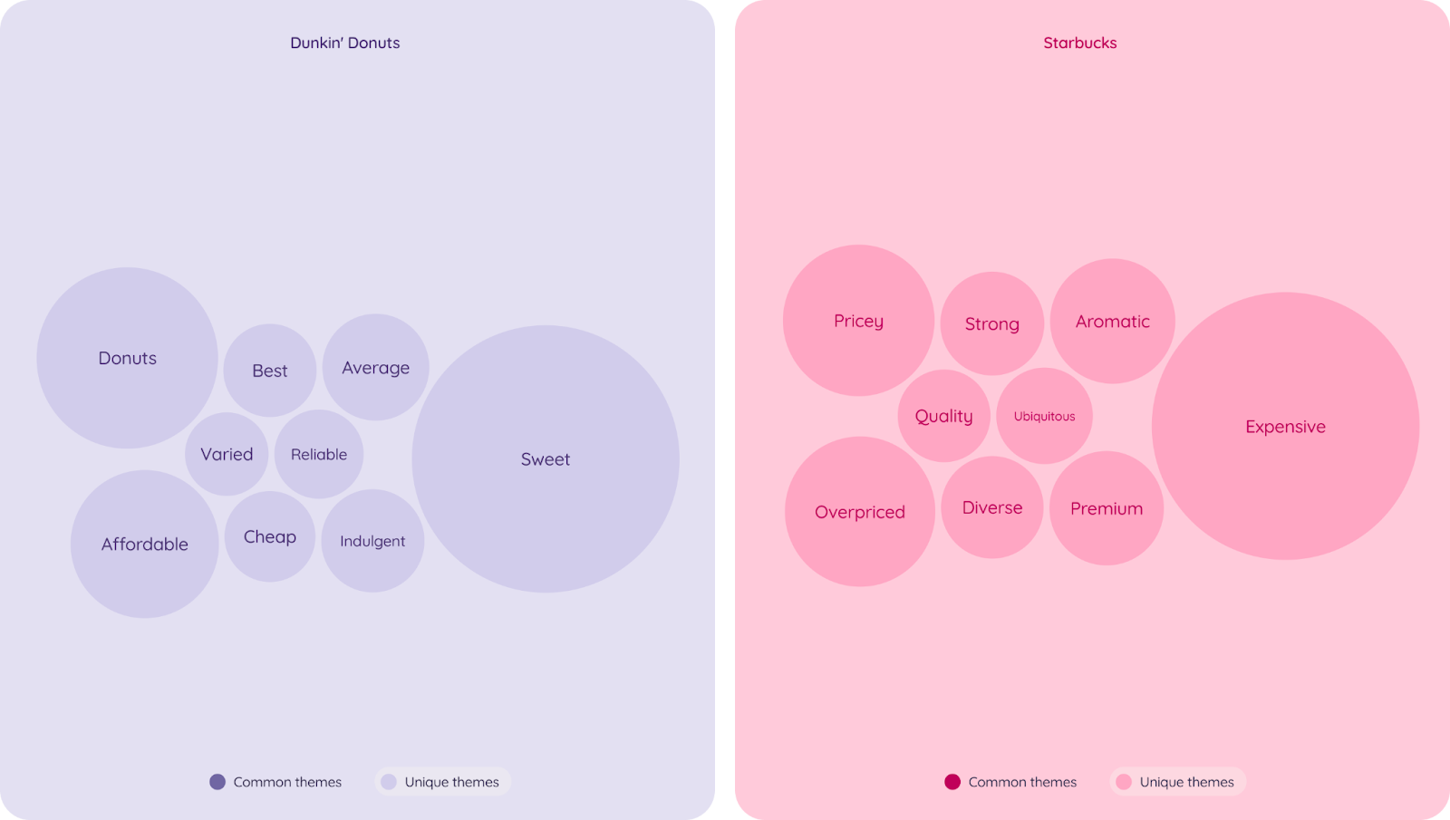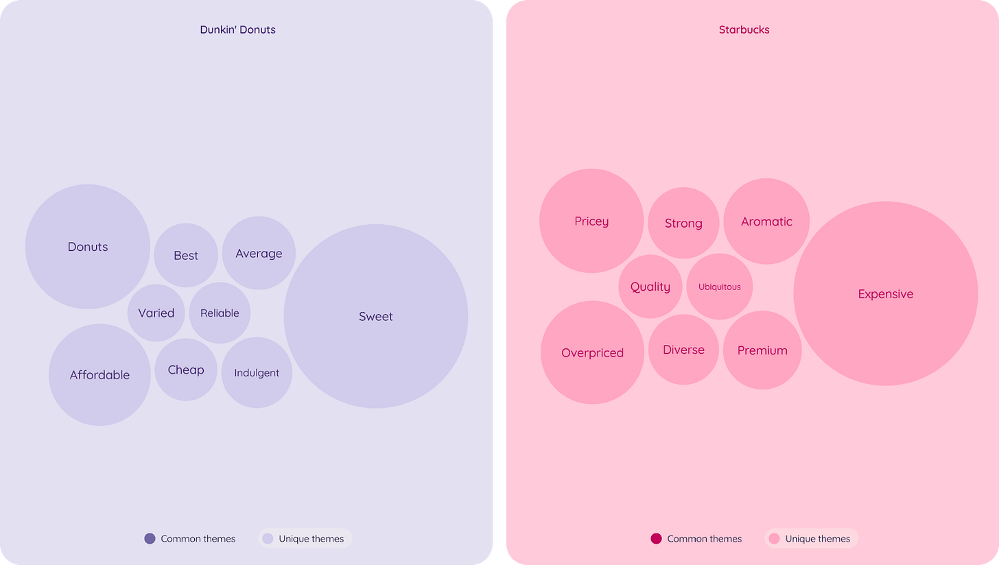 Compared to Starbucks, Dunkin’ is favoured in terms of being perceived as ‘affordable’, ‘sweet’ and recognised for their donuts. Starbucks on the other hand is associated with negative themes such as ‘expensive’, ‘pricey’ and ‘overpriced’.