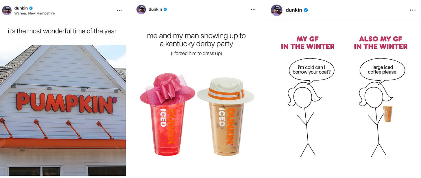 Even its product drops feel like moments, not marketing. Dunkin’ has mastered the art of turning its iconic menu moments like the Pumpkin Spice Season into sharable participatory experiences, where fans do the marketing for them and create hype.