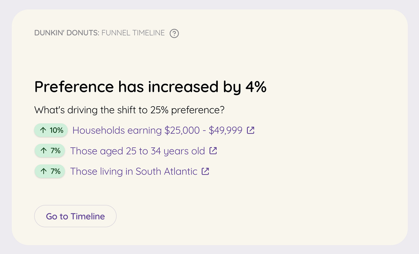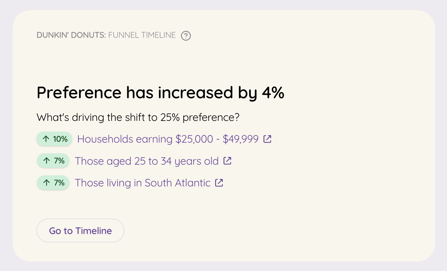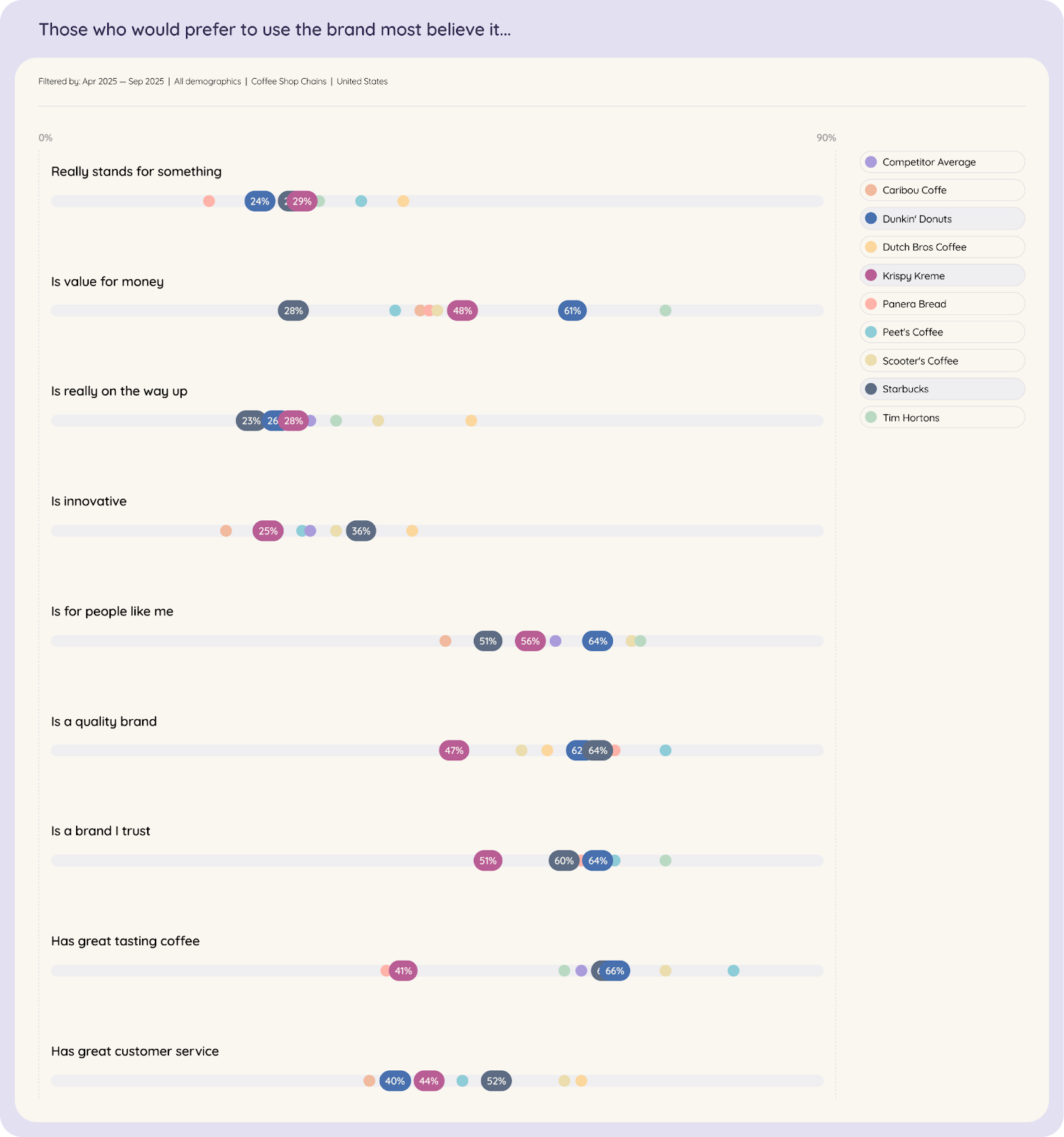 The brand also converts awareness to consideration at 75%, where the competitor average is 66%. This tells us that more people consider Dunkin’ once they become aware of it, compared to their competitors, proof that the brand’s cultural presence is translating into genuine consumer intent and loyalty.